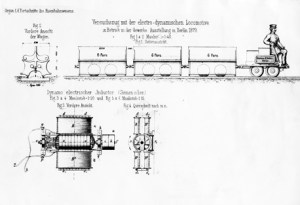 For more information on the 1879 introduction of the first electric locomotive with an external power source, please check out https://www.siemens.com/history/en/news/electric_railway.htm.