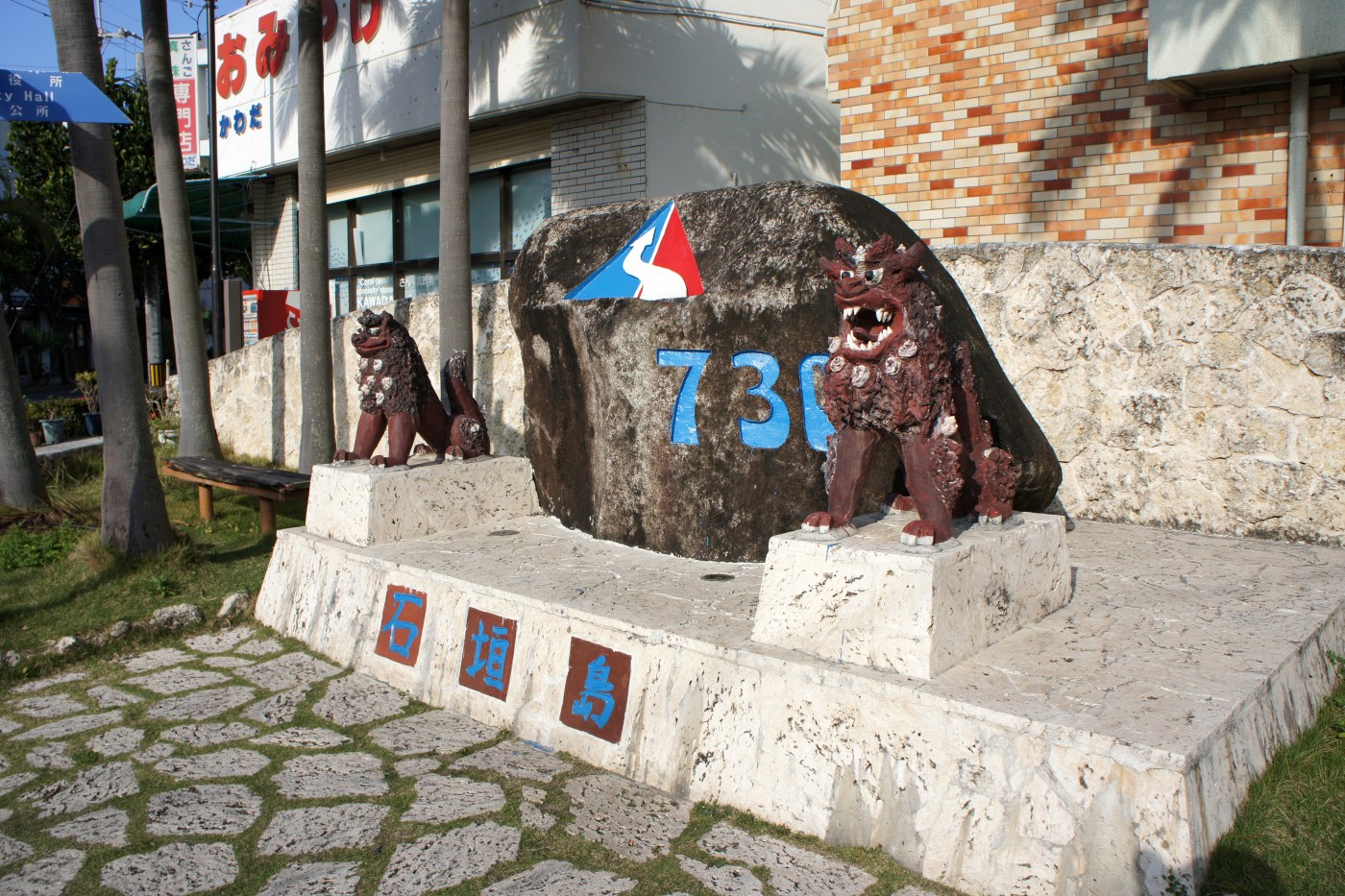 About two months after the day on which Okinawa’s motorists began their switch to driving again on the left side of the road, a stone memorial was set up on Ishigaki-jima to commemorate the date. The three-foot (0.9-meter)-high stone is called the 730 Monument. It is flanked on both sides by shisa lion-dog statues, which are symbols of good luck in this region of Japan. A stylized red, white, and blue logo featuring a traffic arrow was carved and painted into the 730 Monument to represent the shift from right-to-left-hand driving. In the time since its debut, this memorial has become a popular tourist attraction.