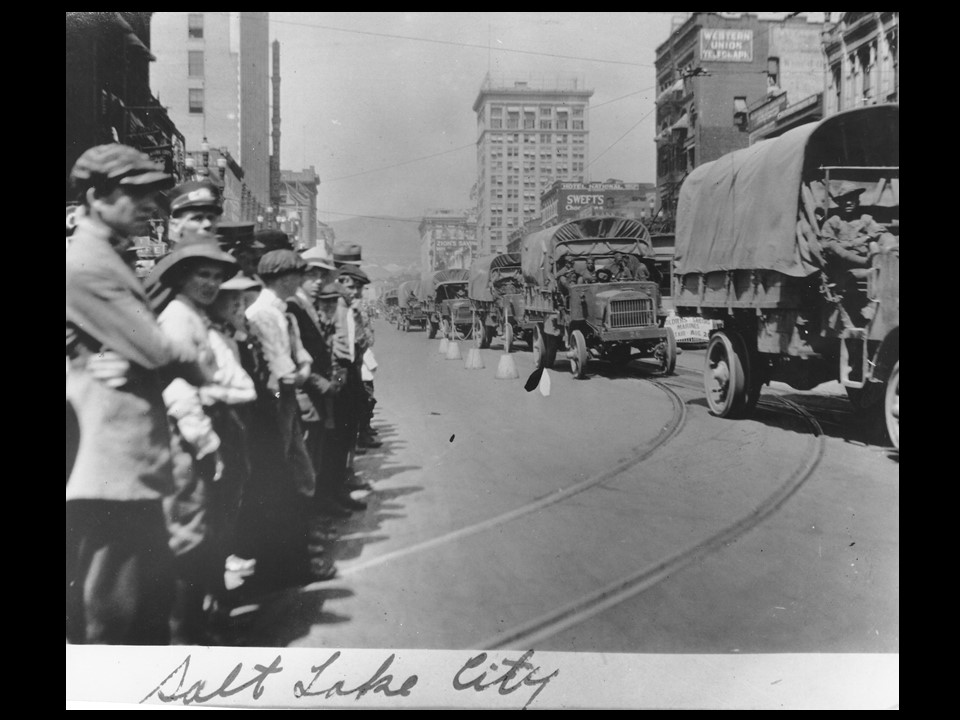 Just a couple of days after crossing from Wyoming to Utah, the U.S. Army’s Cross-Country Motor Transport Train took eight-and-a-half hours to travel 73 miles (117.5 kilometers) from its overnight stay at Glenwood Park in Ogden to Salt Lake City. The imminent stopover of the convoy in Utah’s state capital was awaited with great eagerness by city residents. The Salt Lake Herald-Republican gave voice to this widespread anticipation by asserting in its August 10 edition, “The arrival of the United States army transport caravan in Salt Lake . . . will illustrate the tremendous possibilities of highway transportation and will demonstrate the urgent necessity of linking up national roads.”
