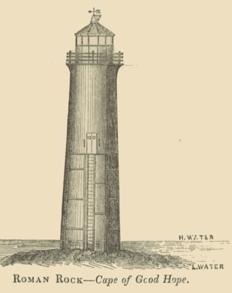 A new lighthouse went into service on a huge rock located in False Bay (a body of water in the Atlantic Ocean) and near Simon’s Town in the present-day Western Cape province of the Republic of South Africa. (At the time of the lighthouse’s debut, this region was part of the British colony known as the Cape Colony; this colony and three others were combined in 1910 to form the Union of South Africa.) The rock on which the lighthouse was built is called Roman Rock, which most likely owes its name to the large number of Red Roman fish inhabiting that section of False Bay.