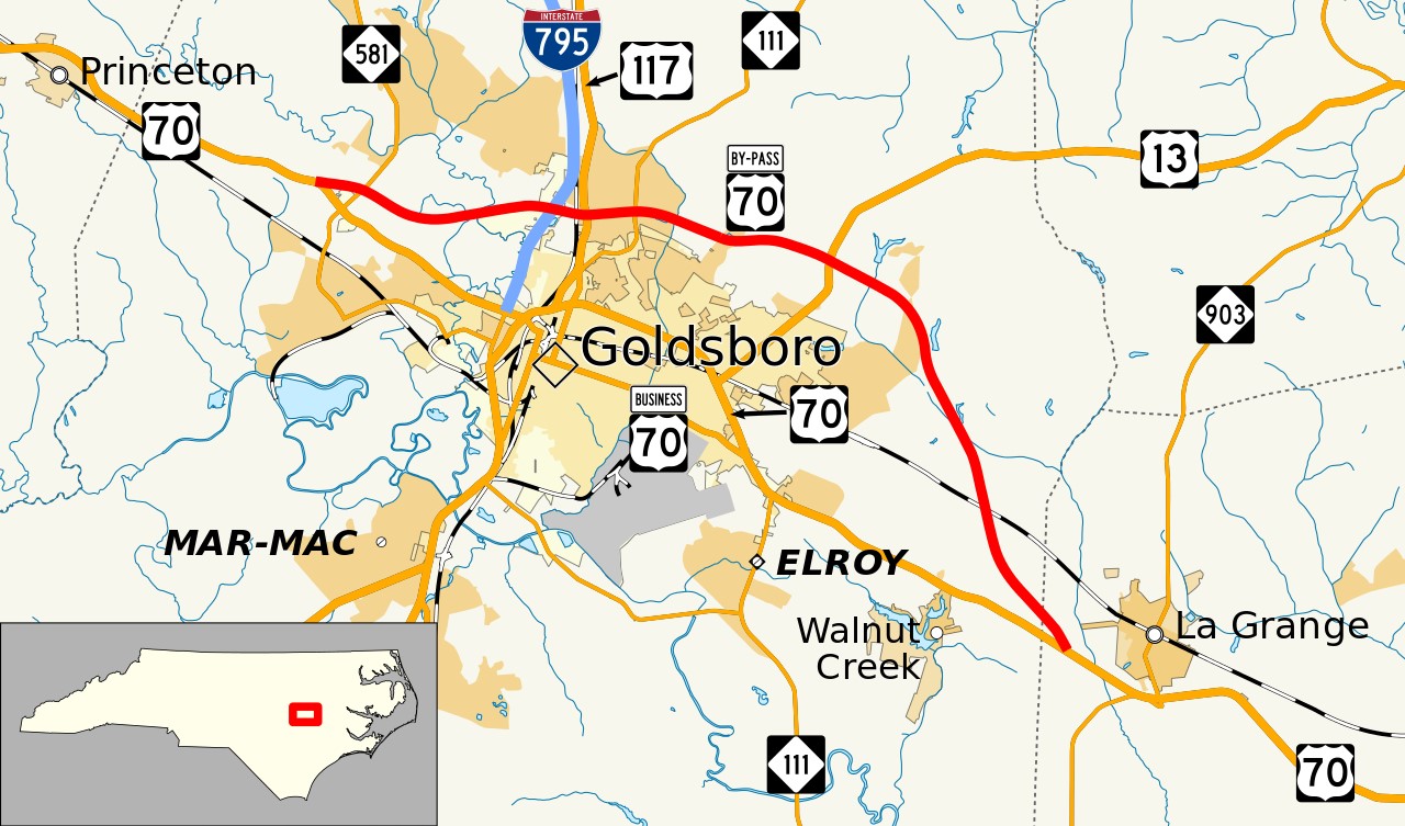 The final and easternmost section of the Goldsboro Bypass, a bypass route of U.S. Route 70 (US 70) in North Carolina, was officially dedicated. In its entirety, this bypass route covers a total of 21.7 miles (34.9 kilometers). The westernmost part of the route starts just west of North Carolina Highway 581 in the vicinity of the city of Goldsboro; the terminus for the easternmost point is in the vicinity of the town of La Grange. This route connects with US 70 at both ends. (The above image highlights the Goldsboro Bypass in red.)