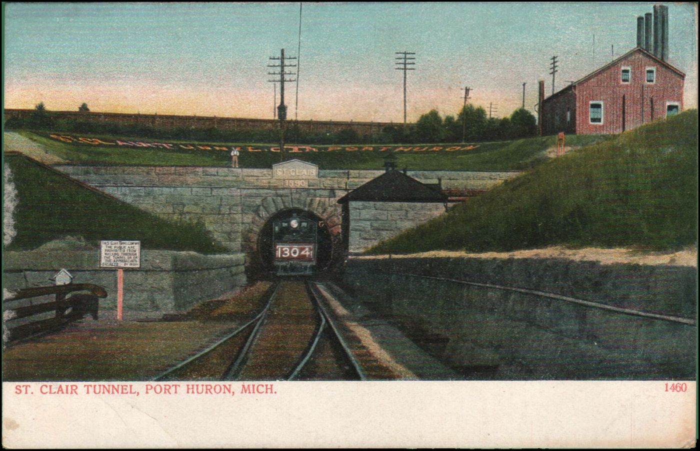 The St. Clair Tunnel, which is featured in above postcard image, was the first large-scale subaqueous rail tunnel in North America. This structure had the additional distinction of being the first underwater tunnel to connect two countries. With a length of 6,025 feet (1,836 meters) portal to portal, it was also the longest underwater tunnel constructed up to that time.