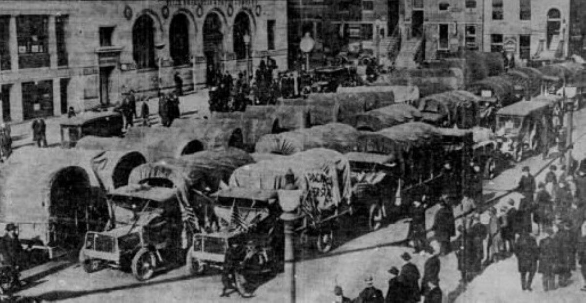Trucks at that time customarily were not driven over long distances but rather transported via railroads. The ongoing U.S. involvement in World War I and the consequent need for multiple trucks at and near the battlefront in Europe, however, increasingly placed an unprecedented burden on the nation’s logistical network. The railroads — already heavily saddled with the transport of freight and troops for the war effort – were stretched beyond capacity, so it was decided to instead organize an overland test-run of trucks to ships docked in Baltimore that could then bring the vehicles to France for use by the American Expeditionary Force.