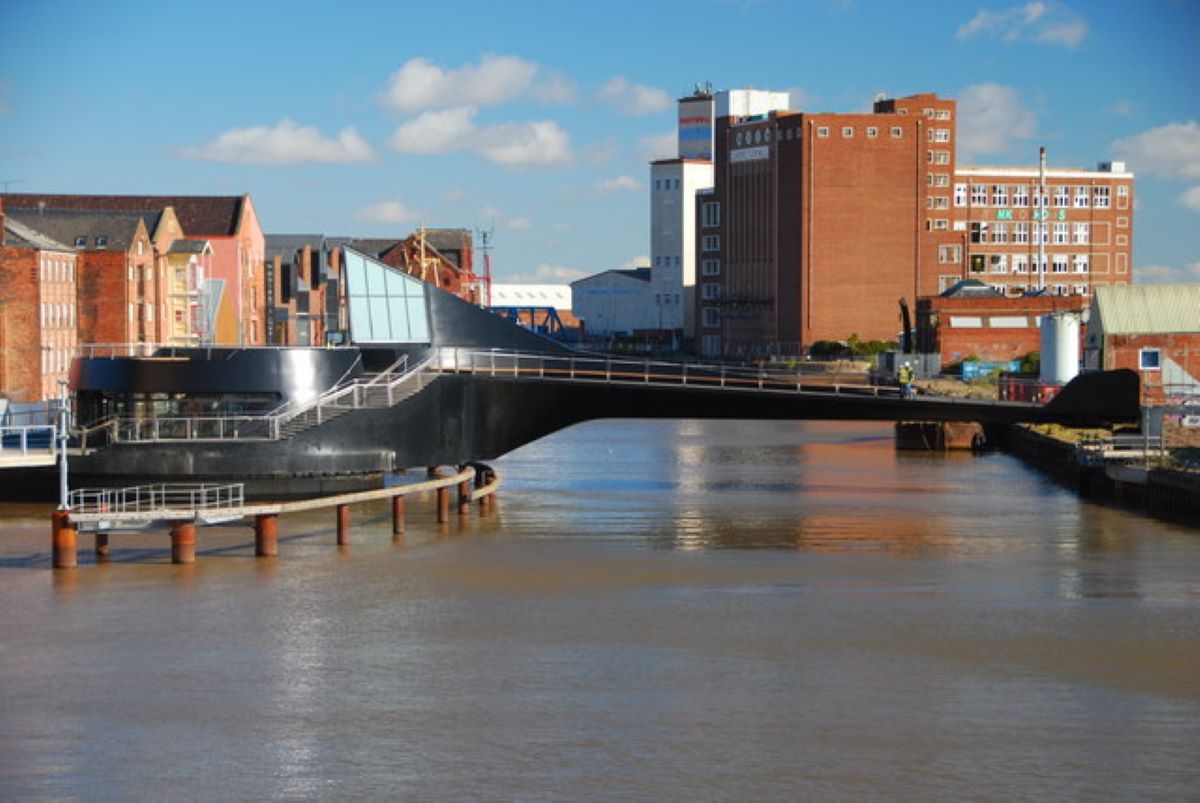 An apostrophe-shaped, cantilevered swing bridge built for pedestrians and bicyclists only was officially opened in the port city and unitary authority of Kingston upon Hull (also known simply as Hull) in northeastern England. This bridge spans the local harbor, which connects with the River Humber, and serves as a link between Scale Lane and Tower Street in Hull.