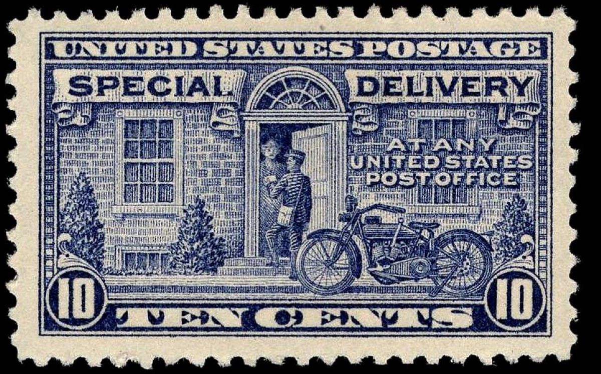 The U.S. Post Office Department (USPOD), which was replaced by the present-day U.S. Postal Service in 1971, issued the first American stamp depicting a motorcycle. This blue 10-cent U.S. special delivery stamp focuses on a postal messenger making the rounds with a motorcycle. This motorcycle was likely based on a Harley-Davidson model. The stamp’s specific freeze-frame image shows the messenger — with his motorcycle parked nearby — standing at the doorstep of a house and delivering a letter to a resident there.