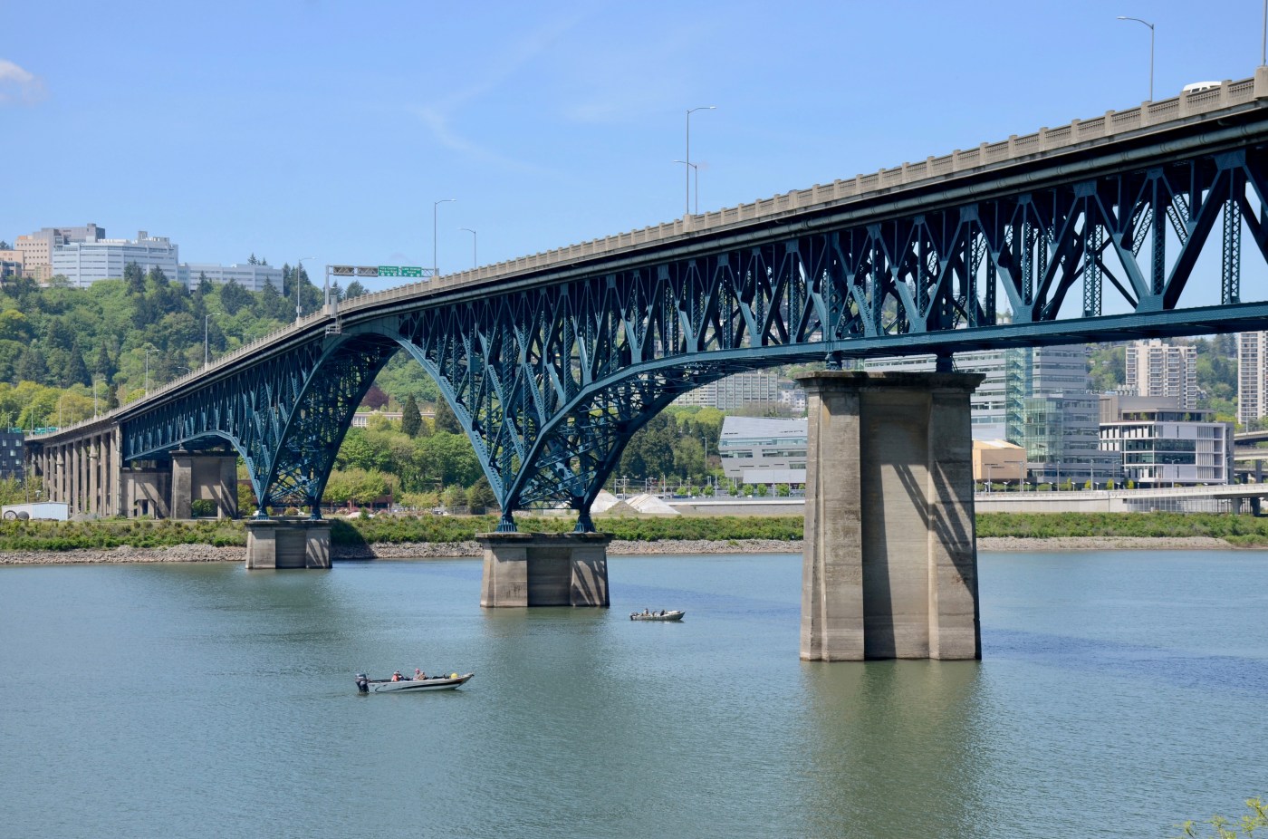The Ross Island Bridge in Portland, Oregon, was opened in what the Associated Press (AP) called “a fitting dedicatory ceremony.” This cantilever truss bridge, which carries U.S. Route 26 (Mount Hood Highway) across a section of the Willamette River between the southwest and southeast parts of Portland, is approximately 800 feet (250 meters) north of the island for which it is named. Ironically, though, there is no infrastructure providing direct access between that bridge and island.