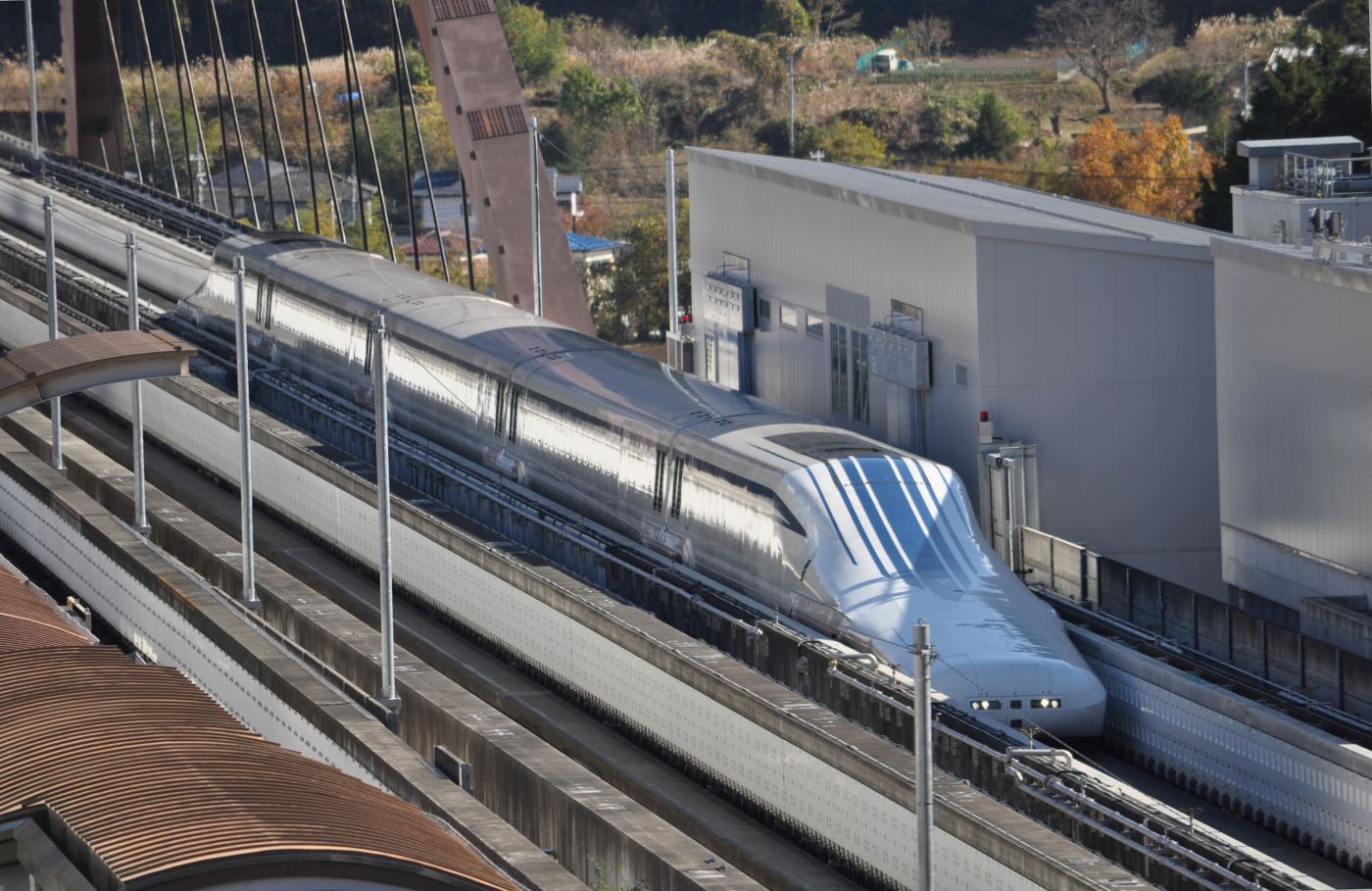 The L0 Series trains have been developed by the Central Japan Railway Company (JR Central), the main railway operator in the Chūbu region, and they are high-speed maglev trains. “Maglev” is short for “magnetic levitation,” and this type of train rises approximately 3.9 inches (10 centimeters) above the tracks and is pushed forward by electromagnets.