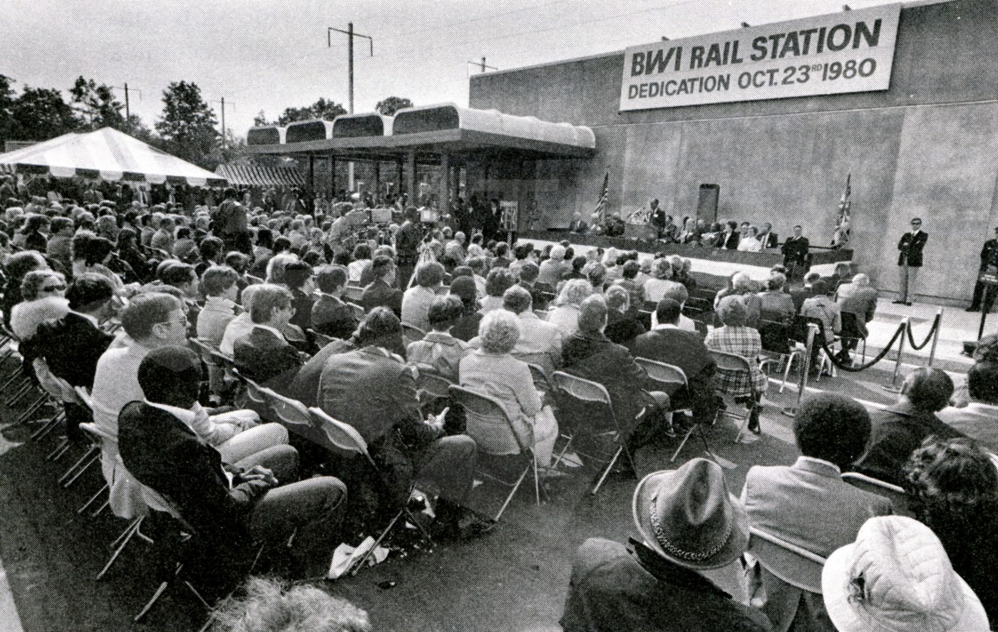 The dedication ceremony for BWI Rail Station took place shortly after noontime and following musical selections from a local high school band. Approximately 700 people were on hand for the festivities. Those in attendance included Harry Hughes, governor of Maryland; Marion Barry, mayor of the District of Columbia; and — as recounted by the Washington Post the following day — “hundreds of others in government and in the air, rail and travel industries. “