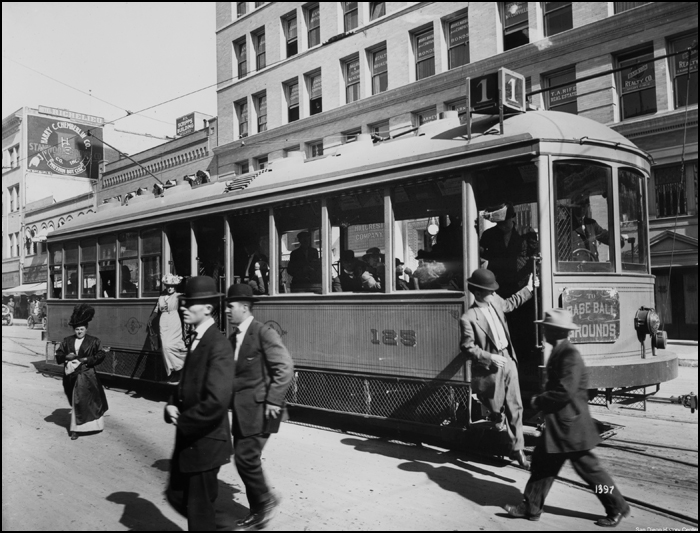 The origins of streetcars in San Diego can be traced back to 1886. On July 3 of that year, the first horse-drawn vehicle of the San Diego Street Car Company began making regular runs on 5th Street in the city. This company had been founded by E.S. Babcock and H.L. Story. The longer-lasting San Diego Electric Railway was formed by John D. Spreckels on November 30, 1891. (The accompanying photo of one of this system’s streetcars was taken at 5th and Broadway Streets in 1915.)