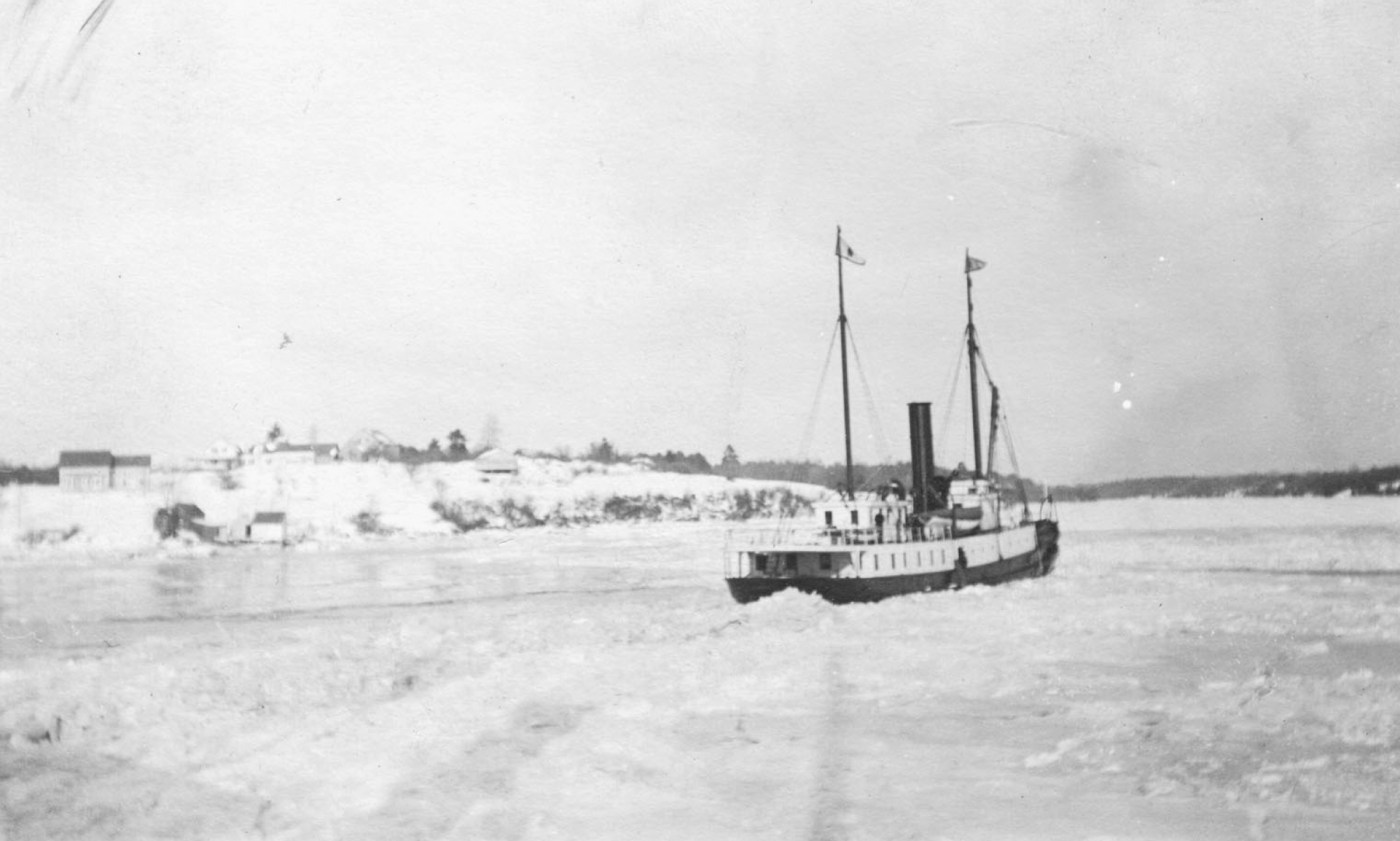 The article did not stop with that rescue mission. “Among other creditable work performed by the tender was the breaking out of the ice and towing the [flat-bottomed barge] Ajax to Vinalhaven,” reported the Evening Express. “This [vessel] was loaded with coal and provisions.” This newspaper added, “The Zizania has also been busy replacing buoys and resetting buoys which have been capsized by the ice.” (The attached photo of Zizania breaking ice was probably taken at some point during that decade.)