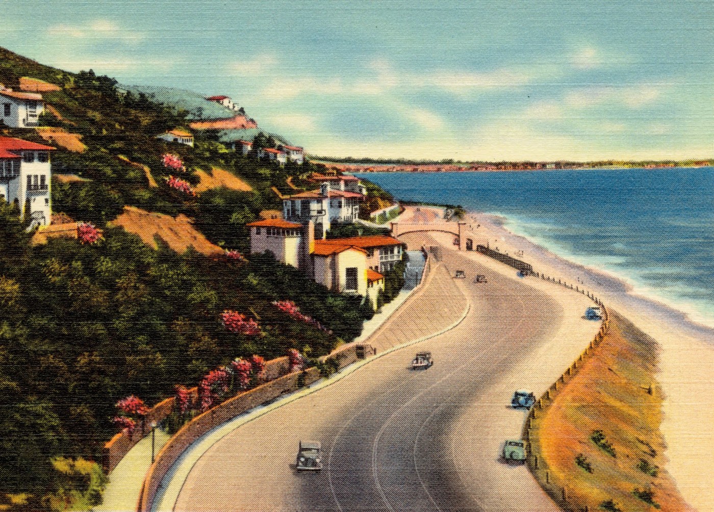Brunner was born in Santa Monica on December 17, 1899. His sightseeing tour efforts began in earnest in 1924, when he took over an automobile passenger service providing tours along Topanga Canyon Boulevard. Each of his tours started out in Santa Monica, with three daily round trips to Topanga Canyon and two to Las Flores Canyon. Brunner also sold one-way fares for people using the service to go to and stay at inns and camp grounds en route, and provided transportation for children attending school in Santa Monica. (The accompanying postcard of a highway in Santa Monica was created sometime between 1930 and 1945.)