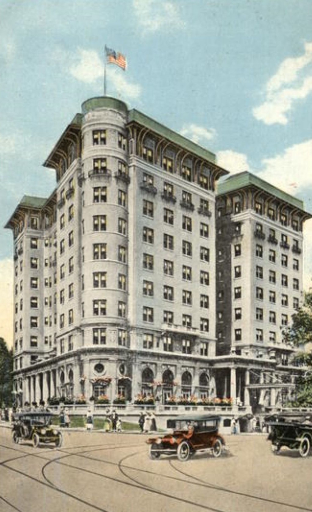This congress, which was co-sponsored by the American Highway Association and the American Automobile Association, proved to be not just popular but pivotal as well. This was due in large part to a meeting of 14 state highway officials on November 11. This Wednesday meeting was held at the Georgian Terrace Hotel, which had been around for only three years by that time, at Peachtree Street and Ponce de Leon Avenue in Atlanta. (The hotel can be seen on the left side of the vintage postcard accompanying this post.) During their meet-up at the hotel, these state highway officials collectively if informally agreed on the need to form an association to advocate for the funding and building of better roads nationwide.