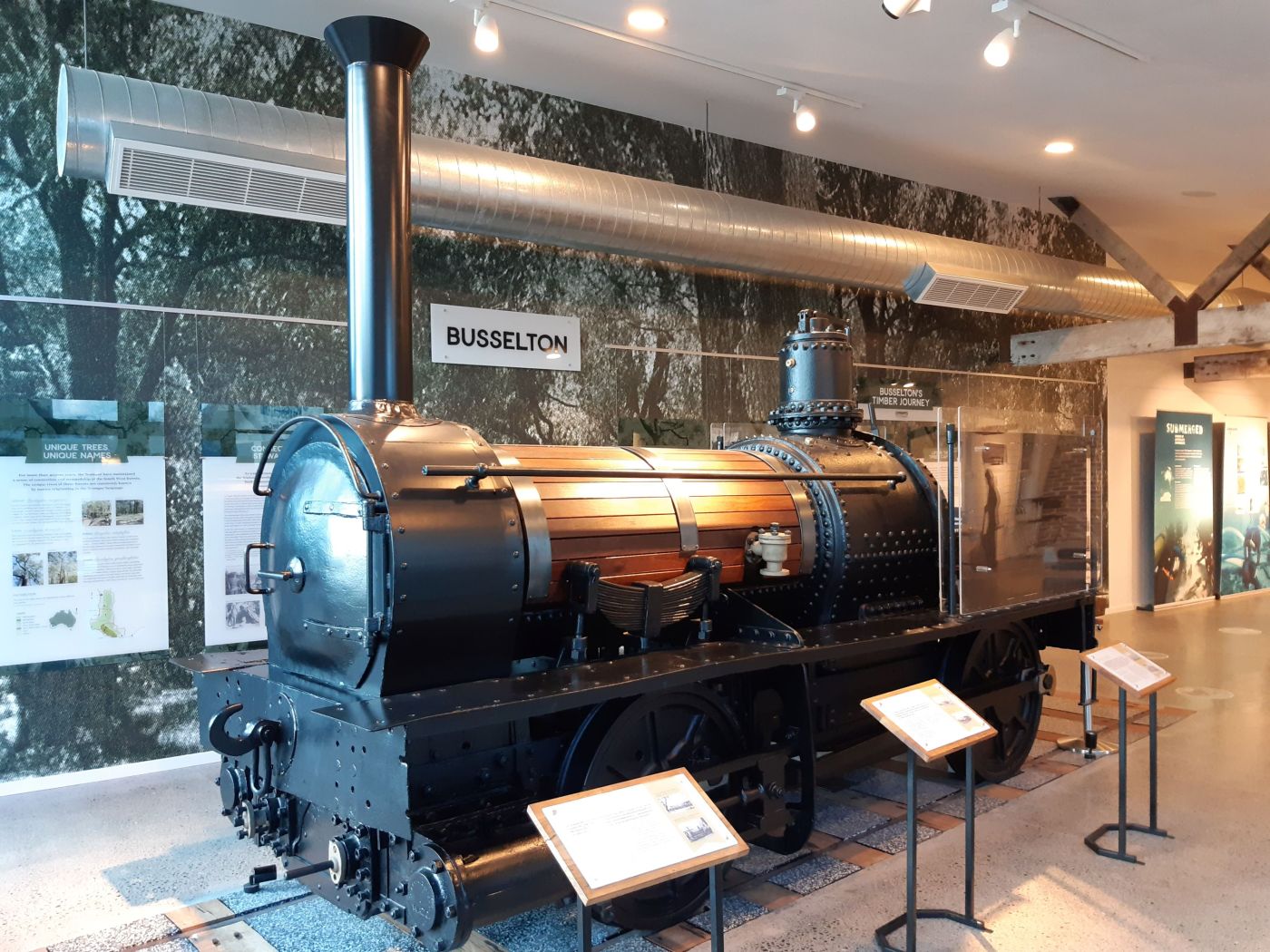 One of the enduring legacies of the W.A. Timber Company’s pioneering but short-lived railway is the Ballaarat steam engine, a locomotive used for the line. The Ballaarat steam engine, which is featured in the accompanying photo taken in 2020, made history in its own right as the first three-foot, six-inch (1,067-millimeter) narrow gauge locomotive to be built in Australia. This locomotive can be seen today at the visitors center in the City of Busselton in WA.