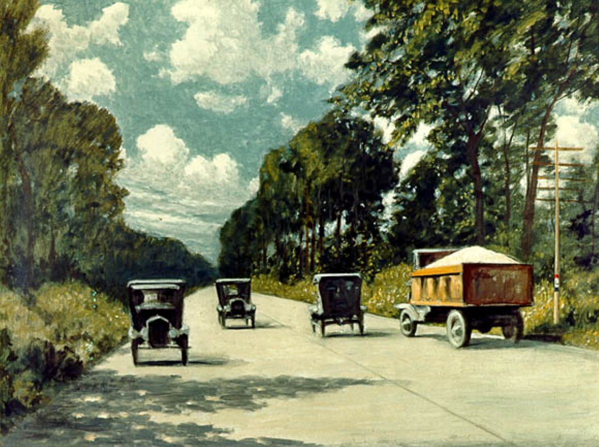 Rand McNally was incorporated in 1873 with William H. Rand (1828-1915) as president and Andrew McNally (1836-1904) as vice president, and the company’s inaugural road atlas reflected the company’s already strong mapping tradition. While few if any copies of that atlas survive today, it is known that the guide contained hand-drawn images of concrete highways for all of the 48 states that comprised the United States in its entirety at that time. (The attached image of a concrete highway in the 1920s was one of many transportation-themed paintings created by Carl Rakeman [1878-1965] during his time as a U.S. Bureau of Public Roads employee.)