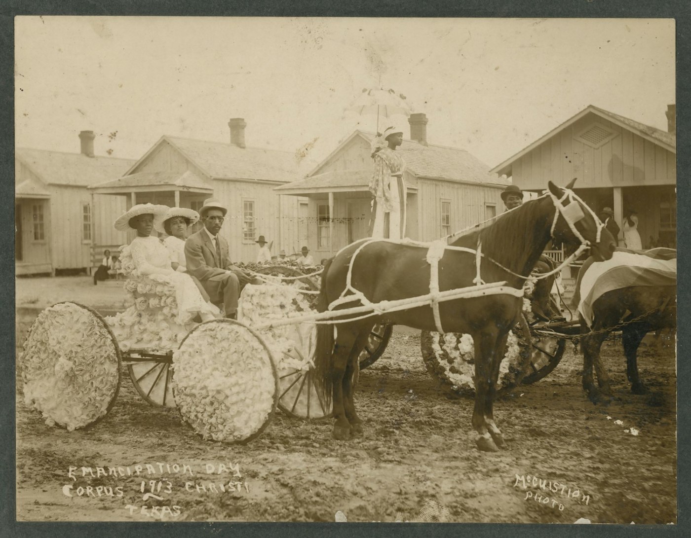 The attached photo shows two women and a man at a Juneteenth celebration in Corpus Christi, Texas, in 1913. For the occasion, they are not only wearing their finest clothes but also sitting in an elegantly decorated horse-drawn carriage. This picture of a flower-festooned vehicle was among several taken by George McCuistion (1878-1928) at that year’s festivities for Juneteenth in one of the Lone Star State’s largest cities.