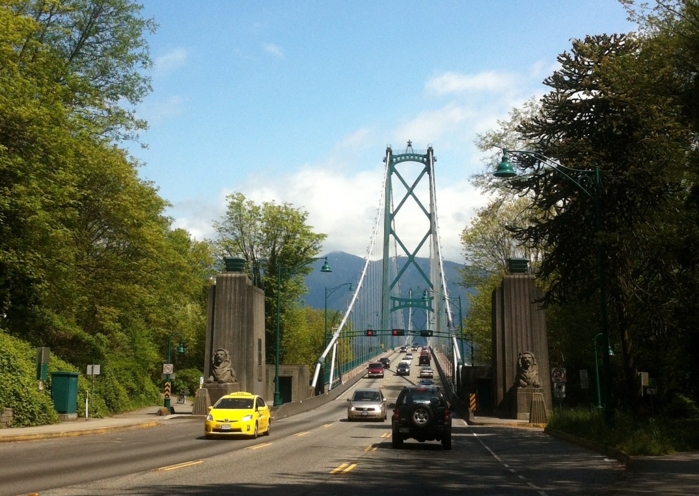 This suspension bridge traverses the First Narrows of Burrard Inlet and links the city of Vancouver with the North Shore municipalities of West Vancouver, the City of North Vancouver, and the District of North Vancouver. This structure — officially called the First Narrows Bridge — owes its most popular name to the Lions, a pair of pointed mountain peaks in that region of Canada.