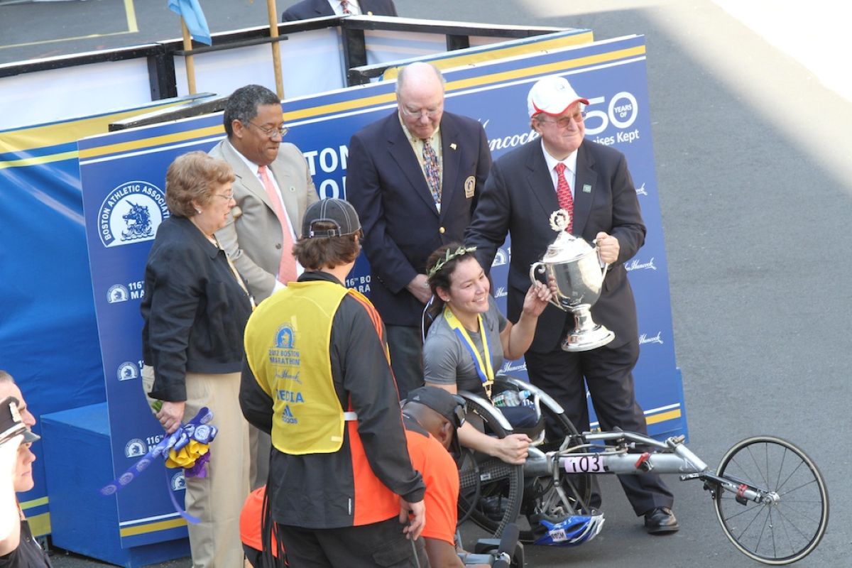 Reilly’s own considerable athletic accomplishments with that means of mobility have included participating in the Paralympic Games in Athens (2004), Beijing (2008), London (2012), and Rio de Janeiro (2016). She won one gold, silver, and bronze medal each in London and another bronze medal in Rio de Janeiro. In addition, Reilly finished first in the women’s wheelchair race of the 2012 Boston Marathon. (The accompanying photo shows her with the trophy she was given for winning that competition.)