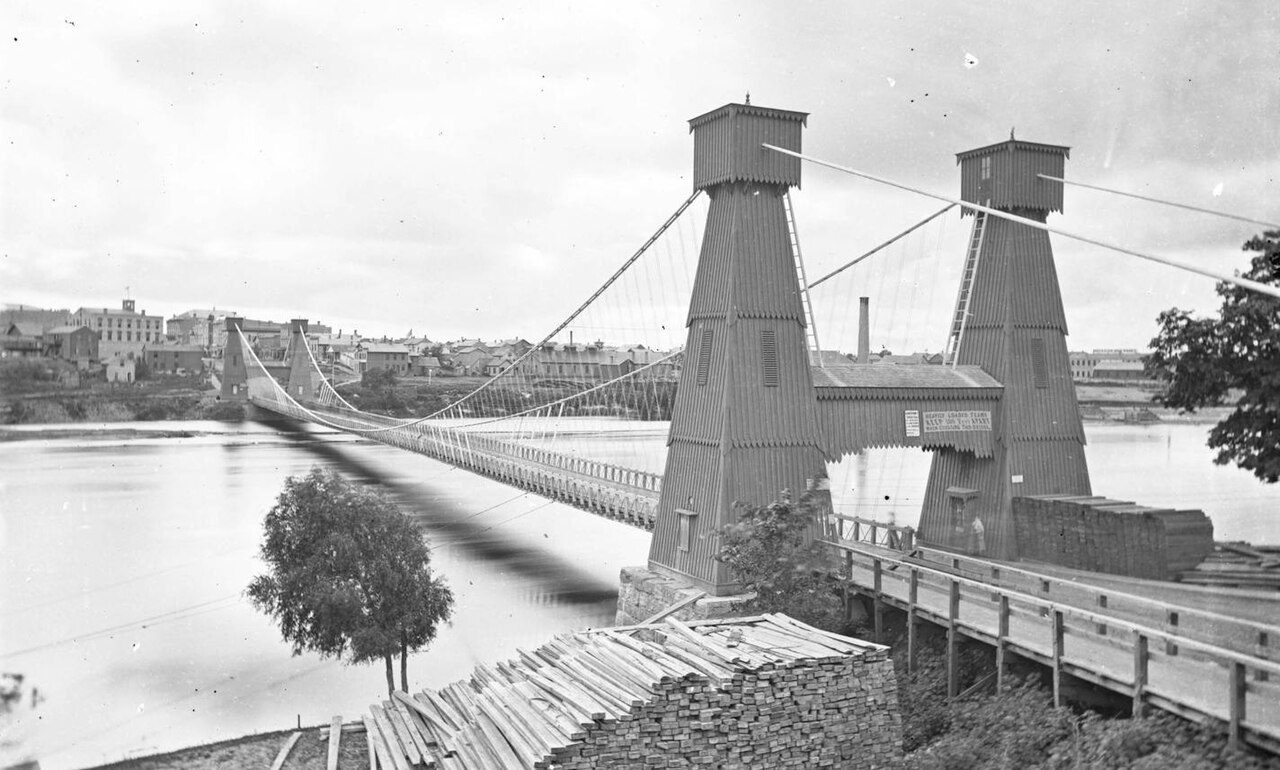 The structure measured 620 feet (190 meters) in length and featured tall wooden towers, wire suspension cables, a stone base, and cast-iron anchors. On the afternoon of this bridge’s formal debut, a large parade that included banners and a marching band — along with sleighs filled with people — gathered in front of the St. Charles Hotel in was then the community of Saint Anthony (merged into Minneapolis in 1872) on the east bank of the river.